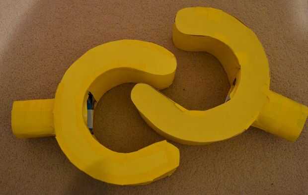 Básicamente lo que hice fue tomar alguna cartulina y dibujar la forma de "C" de la mano y 2 para cada mano. Luego utiliza un cartón delgado (como de una caja de cereal) y cortar tiras de 3 pulgadas de ancho. Envuelve estas tiras a lo largo de los lados todos de la "C".