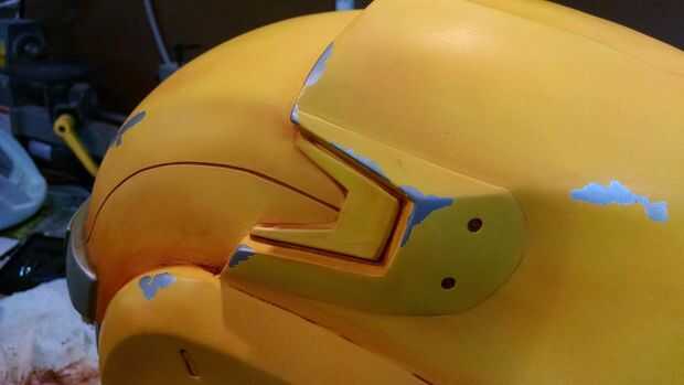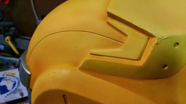 Quería el casco a mucho desgaste y astillas de pintura. Así que antes de que el amarillo puede pasar, he pintado alguna pasta de dientes en los bordes y puntos altos. Donde la pasta de dientes, plata mostrará a través de. Después de la pasta de dientes, viene una capa de color amarillo claro. De un tono amarillo más anaranjado se aplica con un aerógrafo. Esto da el casco algunos agradable edad y dimensión. El enmascaramiento entonces fue quitado y aerografía más fue hecho a la porción de plata del casco. Ahí agregué grises oscuros y negros a las grietas.