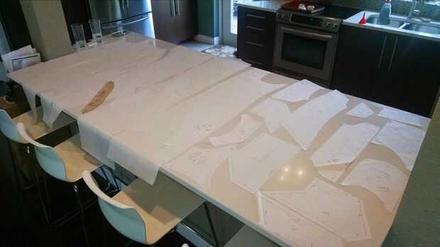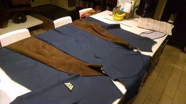 La vida capas comenzó como un golpeteo que estaba relativamente cerca de la capa en el juego. Después de una larga búsqueda, colocado en el patrón de capa de v8940 de Vogue. Este es un largo camino desde la capa final, pero tenía buenos huesos. Para esta parte se alistó la ayuda de mi esposa. Ella era gentil para ofrecer su asistencia con la copiosa cantidad de costura. Primero hicimos el patrón original, completamente fuera de la muselina.