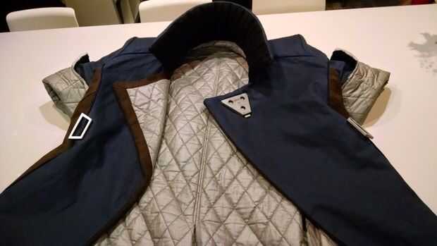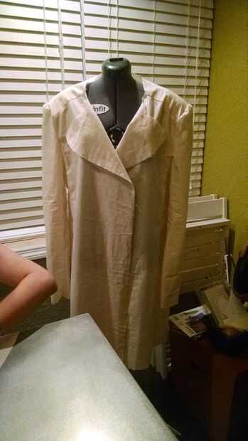 Después tuvimos el patrón alterado, hicimos otra versión de muselina de la capa. Esta vez fue totalmente forrado y entretela y tuvo docenas de costuras extras. Hicimos esto para encontrar algún problema nuevo o restante con el patrón que hemos alterados. Hicimos unos ajustes más y se trasladó a la capa final.
