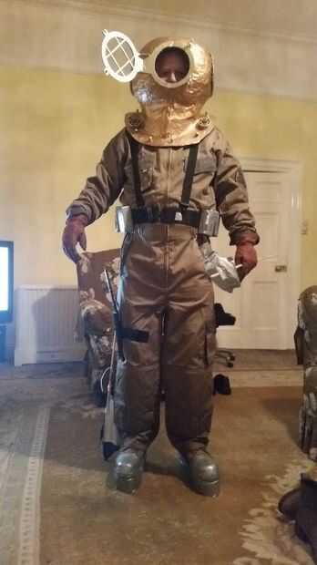 Las rejillas, parte delantera, están hechas de foamboard de 5mm, cortar con un bisturí muy afilado, con un diámetro interno de 125mm y 175mm de diámetro exterior. Se va a utilizar acetato para el vidrio, pero decidió no molestar como se escucha mejor sin él y no llegar tan caliente dentro. Usé real tuerca y tornillos para la parrilla delantera. Roció el casco de cobre y las rejillas de oro. Nota, aerosol del coche funde el núcleo de la espuma del tablero de la espuma. En cualquier caso, las rejillas no se sientan apretados al casco así que cubrí el hueco con una tira de papel rociado oro sujeto con chinchetas de cobre amarillo. Las doce cabezas de tornillo alrededor del cuello se rocían cosas de plástico en una ferretería, mientras que las cosas más grandes en el cuello son núcleos de plástico sobrantes de papel. La manguera que sale de la parte posterior es lavavajillas, rociado. Tuve una idea que se iría para arriba verticalmente y ser sostenido por un alambre rígido, pero se complicaron demasiado. El boilersuit fue inesperadamente difícil de encontrar y es un juego de caldera de alta calidad marrón de algún Reino Unido fabricantes de monos. Un traje de papel podría hacer solo también. Hice tarjetas, incluyendo la insignia de la marca V de nosotros Marina casco y había pegado en su caso. La correa es un cinturón de utilidad de cinta negra, con refuerzos de nylon negro en. La bandera es la bandera "A" del código internacional para diver down, e hizo el cuchillo y la funda de cartón y pegadas con cinta aislante negra a mi pierna. Hecho el pescado de stryrofoam cubierto en cinta de plata y utiliza una clavija de madera de 10 mm afiladas como la lanza. Los pesos de plomo son espuma de poliestireno con cinta de plata, grabado en el cinturón y los zapatos con una única capa en forma de aislamiento de la pared de 50mm (2") grabado en con cinta de plata los peces y la red fueron apoyos muy costosas y realmente innecesarios de una compañía de Reino Unido llamado"Apoyos 4 U"o algo similar. Tiene algas realmente muy maloliente, salada y arena de la playa y tenía un altavoz Bluetooth en mi cinturón que podía ser operado por teléfono y jugó bien el tema de las mandíbulas o "Beautiful Briny mar" de Bedknobs y Broomsticks o un efecto de sonido excelente buceo con burbujas y la respiración pesada