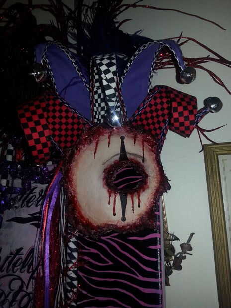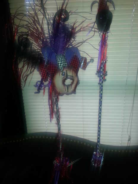 En este punto añadí los triángulos tipo de bufón en el interior de la máscara. Los triángulos consistió en cartulina que fueron forzadas con alambre y cubierto con tela. Yo luego luego había recortado les con emparejar recorte. Añadí las campanas a cada punta y había rizado los triángulos de mi agrado. Luego he añadido plumas y numerosos accesorios, que se suponen para ser utilizado para arreglos florales... pero no en mi casa!! Lol he añadido a una tela espiga y mucha cinta y allí tienes la máscara de la mascarada de bufón malvado piel.