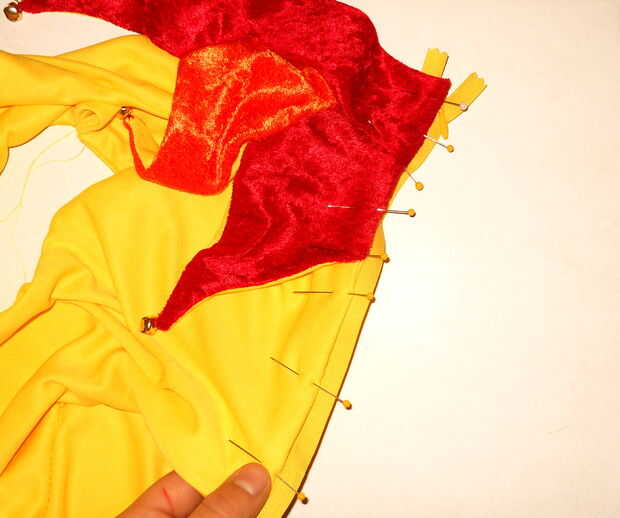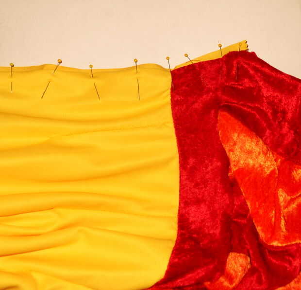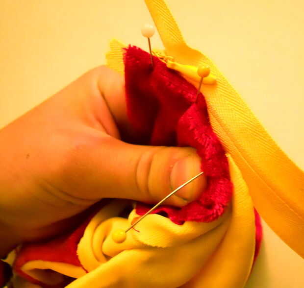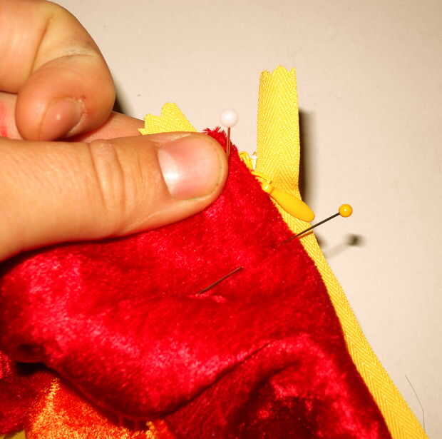 Para el primer lado, usted puede comenzar con la cremallera cerrada o abierta, no importa. Pin el borde del vestido de la cremallera, comenzando en la parte superior y hacia abajo. Lat el extremo del anillo en el vestido y el pin para la cremallera. El collar no se unirá a la línea del cuello del vestido, pero los volantes cubrirá y gap. El collar se unirá a la cremallera y el vestido en cualquiera de los extremos. Recomiendo usar tantos pernos como sea posible. Más pins equivale a menos errores. Ahora, cosa a este lado de la cremallera en el vestido.