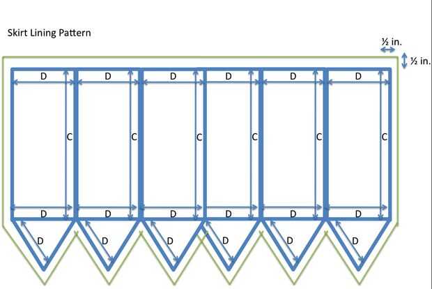 El forro de la falda es exactamente el mismo tamaño y forma que la falda, pero corté este pedazo hacia fuera en dos piezas en lugar de doce porque es un color sólido y su menos coser si utilizas trozos más grandes. Para utilizar el patrón de falda para la guarnición, cortar el margen de costura en los lados largos de la wo del rectángulo. Trace el patrón en el lado equivocado de la tela de la guarnición en tiza seis veces con patrón alineado con el trazo anterior. Cuando su acabado debe ver como una valla de piquete. (ver cuarta imagen)