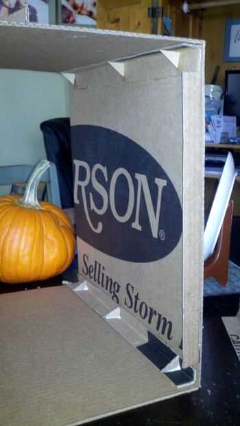 • Continúe este proceso de cinco lados de la caja. Antes de agregar el quinto panel, corte un agujero en el centro de la misma, grande lo suficiente como para fácilmente poner la cabeza a través de.