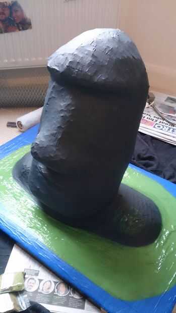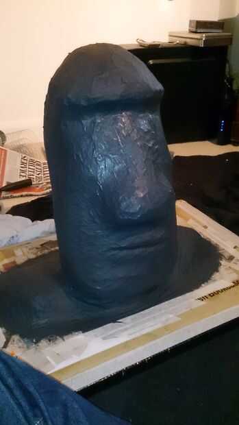 y así llegó el momento de pintar. Como se puede ver, después de algunas investigaciones fui con un sabor gris stoney para la cabeza, con un agradable verde verde de la isla y un hermoso de cielo azul para el mar. Debido a la mencionada falta de cinta adhesiva, tuve el problema de la malla de alambre de pollo, mostrando a través del papel. Creo que esto sucedió durante el proceso de secado, ya que la pulpa se contrajo alrededor del marco y fue aspirada ligeramente en los agujeros. Si hubiera tenido más tiempo dedicar a este proyecto, habría hecho al menos dos capas más de papel, con el tiempo de secado, antes de pintar. De todos modos, dejar secar todo lo que y luego pasar el rebaño...