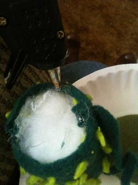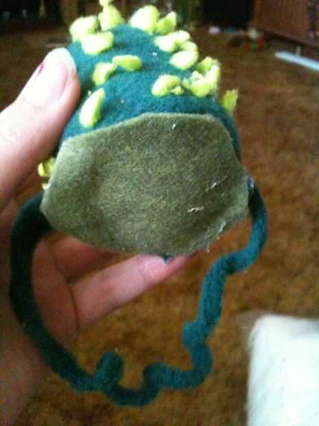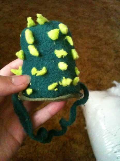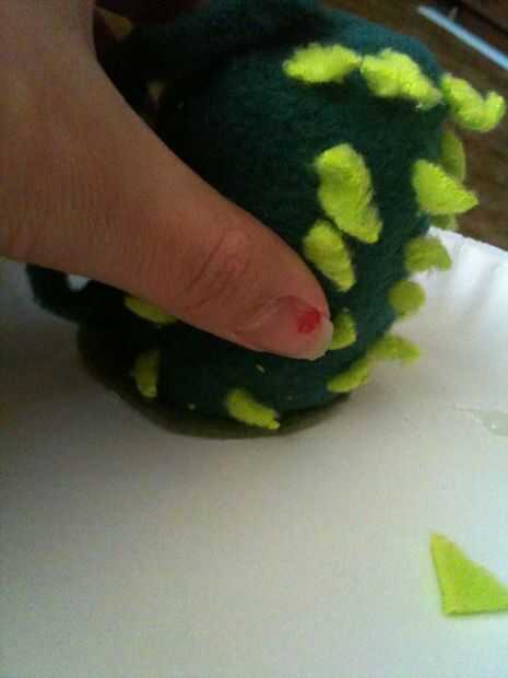 Poner pegamento todo el camino alrededor de la base de los cactus y el palillo a la pieza de fieltro.