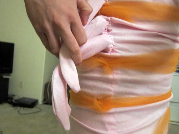 Tome su tul naranja y córtala en tiras de seis. Coser cada tira sobre el vestido en el lado bajo el brazo. Si, como en mi caso, el tul no es tan elástico como el material del vestido, es más fácil coser las tiras sólo en un extremo para las rayas que van alrededor del pecho. Las piezas sueltas son entonces cubrió o atadas en el lugar después de que el vestido es en usted. Esto le permite tirar el vestido. Para las tiras hacia la falda, querrá coserlas en ambos extremos para que no caiga al caminar o bailar tus movimientos shrimpy.