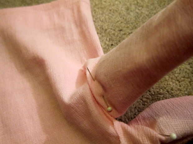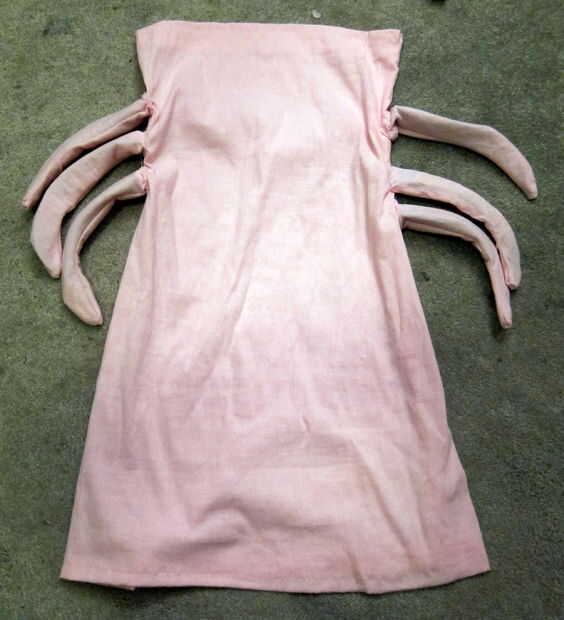 Dibujar las formas de la pierna en alguna cartulina y recórtalo. Hice seis de ellos, pero camarón real puede tener muchos más. Seguimiento de cada forma en un doble espesor de tela rosa y cortar la forma con margen de costura. Coser las piernas de adentro hacia fuera, luego abrirlos y poner el cartón interior de los tubos pequeños de tela. Estos coser (a mano) en su vestido o camisa. Si tienes un amigo para ayudarle con la colocación, será más fácil de conseguir en el lugar correcto.