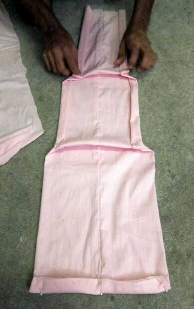 Antes de colocar la cola de su vestido, la tela en el centro una pizca y perno desde el interior. Esto le da la cola alguna curvatura, como un camarón.