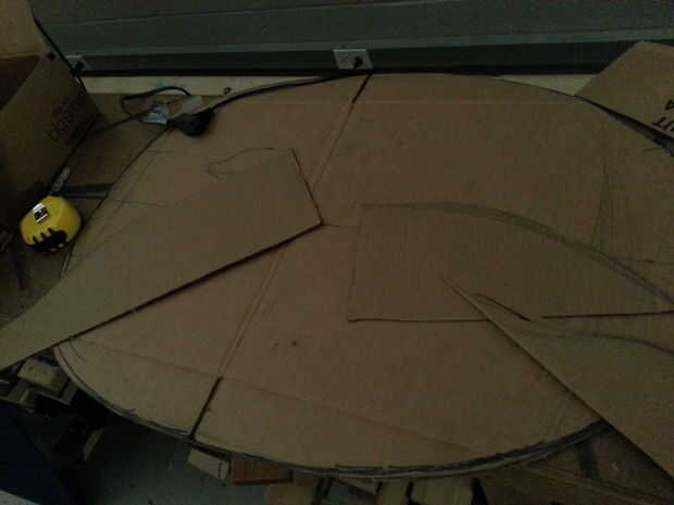 he encontrado una imagen en internet de que modelo de la cáscara.  Tomé las medidas de la actriz desde la parte superior de su continuación hasta aproximadamente cuatro pulgadas por encima de la parte posterior de su rodilla.  Fue cerca de 34 pulgadas.  Pensé que una buena proporción de ancho a la altura sería 2/3 por lo que mide un rectángulo de 34 "x 22" en un pedazo de cartón.  La forma fue dibujada a mano alzada.  Yo simplemente redondea las esquinas delanteras y luego afilado la parte trasera para que sea más amplio en el frente por alrededor de una pulgada.  Para hacer la forma redondeada, se determinó que cerca de seis pulgadas sería suficiente para dar dimensión sin ser demasiado incómodo para usar.  Corté un 6" pedazo de cartón de ancho y curvado en la parte delantera y trasera para hacer la forma de la concha.  El frente sacado con pala hacia abajo y luego para hacer el área del cuello.