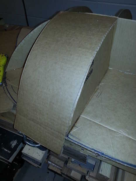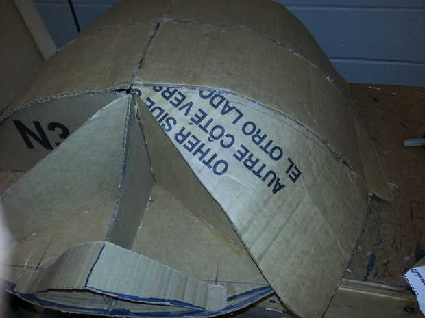 Cada sección de la cáscara fue hecha por pegar una hoja de cartón sobre una sola célula de la estructura nervada.  Corrugación de cartón se desglosan para obtener una curva Lisa a lo largo de las costillas.  Para ello, sujetando los dos extremos de la cartulina y correr por el borde de un escritorio.  Esto romperá la corrugación interior y '