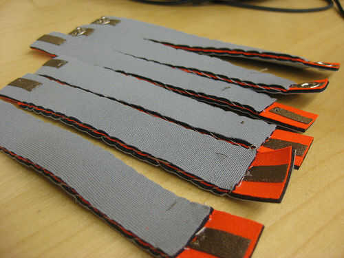 La primera tela doble sensores que fabricados con dos capas de neopreno de 1,5 mm, que se ha jersey de poliéster adherido a cada lado. El hecho de que la tela fue montada a cada lado del neopreno realmente posible fundir un trozo de tela conductiva a cualquier pieza de neopreno con hierro-en interfaces, un pegamento de calor común en acolchado y costura. Entre las dos piezas de tela conductora intercala un trozo de Velostat, que es básicamente el negro plástico que sensibles componentes electrónicos o circuitos vienen en para protegerlos de cargas eléctricas o carga estática se. Velostat es poliolefina impregnados de carbono y es un mal conductor pero también tiene la calidad para reducir su resistencia bajo presión.