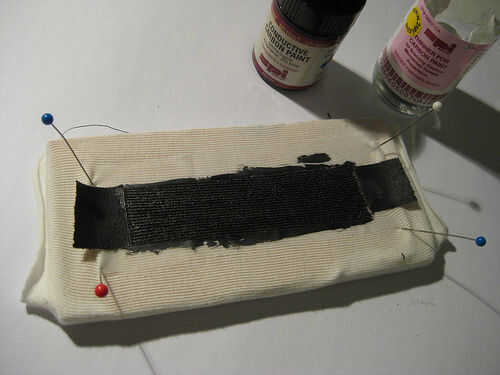 Una técnica que produce unos resultados encantador es la aplicación de pintura de carbón a la tela. Función del espesor de la pintura y el tejido subyacente, uno alcanza resultados diferentes. Si la pintura comienza a agrietarse demasiado, entonces cuando estira los fregaderos de conductividad, ya que simplemente no hay conexión física a menos. Pero si las cosas salen justo y no hay demasiado mucho grietas entonces la conductividad aumenta cuando están estiradas y creemos que esto es debido a que las partículas de carbón están siendo comprimen aunque la fisicidad del estiramiento y así mejorar la conexión de conductor.