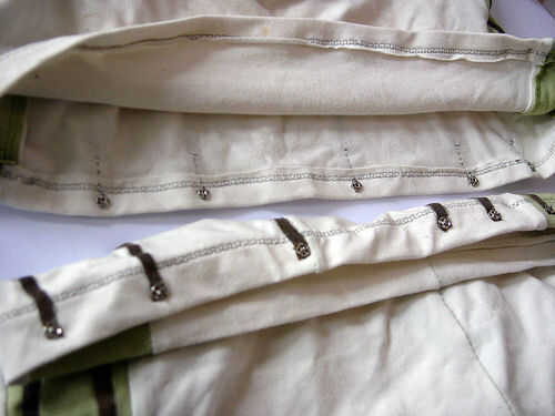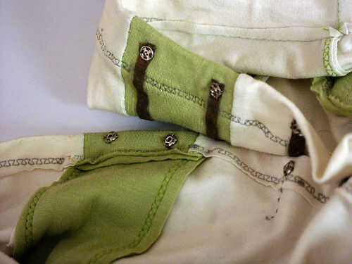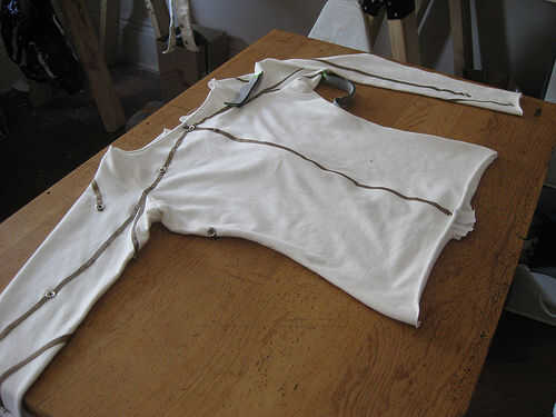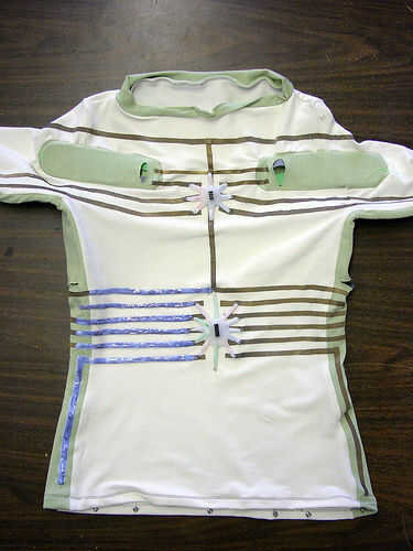 Después nos hemos fusionado entretela para un pedazo grande de tejido conductor de LessEMF (www.lessemf.com), cortar en 5mm ancho tiras y entonces son capaces de fusionar al traje con el calor de una plancha. Una vez los rastros luego aislamos cubriéndolos con una buena capa de pegamento de tela elástica Flexible de Aleene (http://www.duncancrafts.com/). Hemos encontrado esto para ser la mejor solución hasta ahora. No afecta la conductividad de la traza, ni hace mucho impedir en la elasticidad de la tela. Se seca en un día y después de 10 días de tiempo de curado puede incluso ser muy lavado con agua tibia y un detergente suave. La primera versión de titiritero no tela conductora pero habían disfrazado de la fragilidad de los hilos finos, por darles de comer a través de la tela de los tubos. La segunda versión de titiritero utilizamos sólo el pegamento de la tela elástica para aislar las huellas y luego algún talco en la parte superior para quitar su viscosidad inicial, incluso una vez seco que les gusta pegarse entre sí. Para la última versión de titiritero que usa el pega tela elástica para aislar así que las tiras de montaje de la misma tela blanca, para que fueran menos prominentes, pero aún parte de la textura y el diseño del traje.