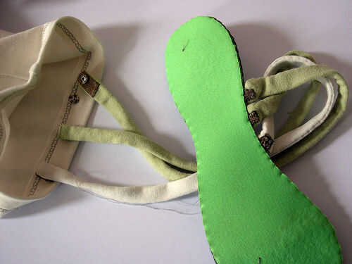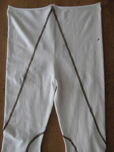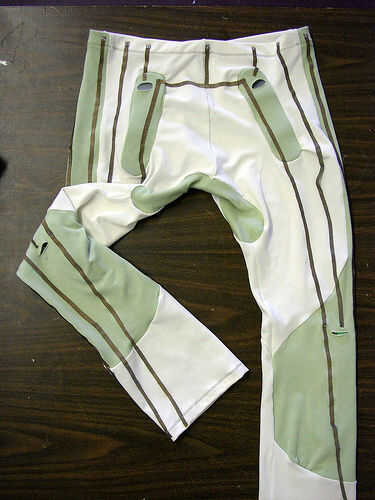 Nuestro método preferido (hasta ahora) de la creación de estas trazas conductoras, que distancias de cobertura hasta un máximo de 1.5-2 metros (al llegar a los dedos del pie), es trabajar con las tiras lo de estirar la tela conductora. Este método nos permite crear a tejido elástico, cómodas, lavables conexiones conductoras que tienen una resistencia de unos 100 Ohm/metro. Otras opciones serían utilizar hilo conductor, pero puesto que trabajamos con materiales elásticos y la puntada elástica utiliza mucho más hilo que directamente cosido, alcanzaría mucho mayor resistencia con hilo. También, para poder coser con una máquina de coser, el diseño completo de los rastros conductores en la demanda tendría que tener claro antes de que el juego está montado y esto nunca ha sido el caso, ya que hay tantas incógnitas antes de que la bailarina primero se pone el traje terminado, y nos resulta mucho más fácil poder hacer modificaciones cuando se usa el traje y podemos ver exactamente cómo encaja y donde mejor para colocar los sensores.