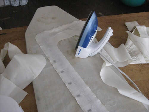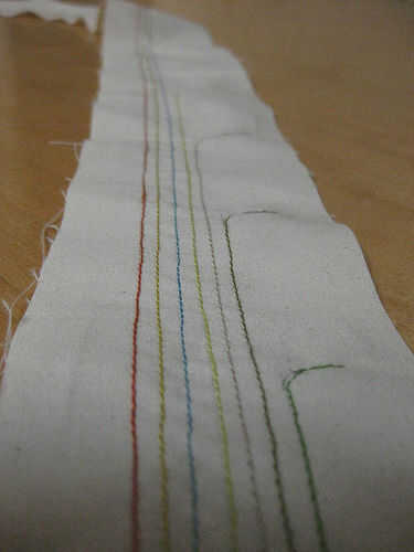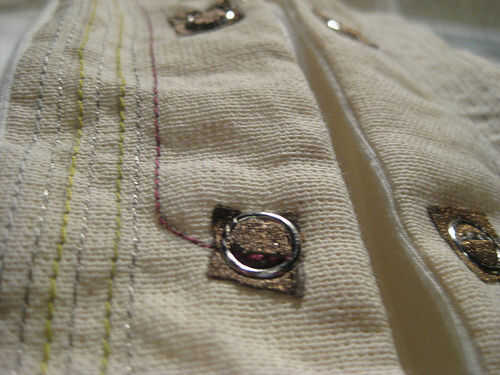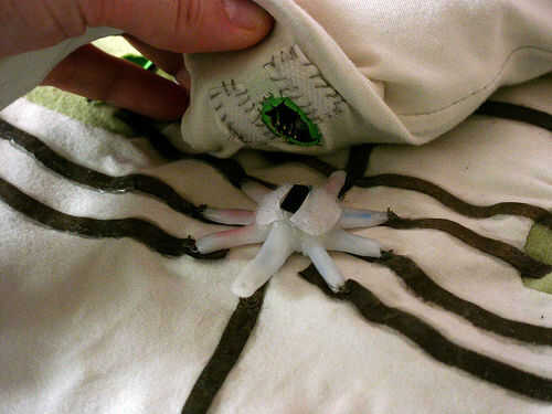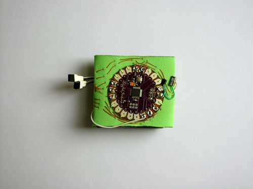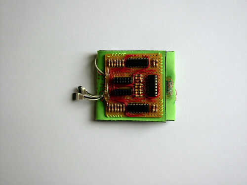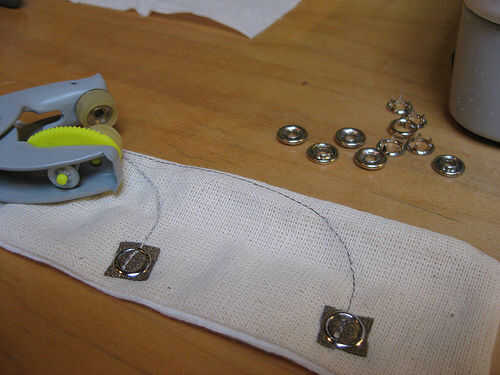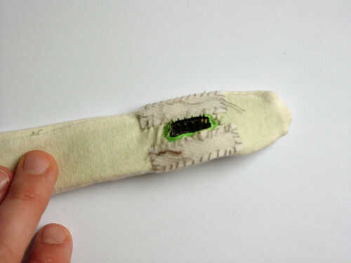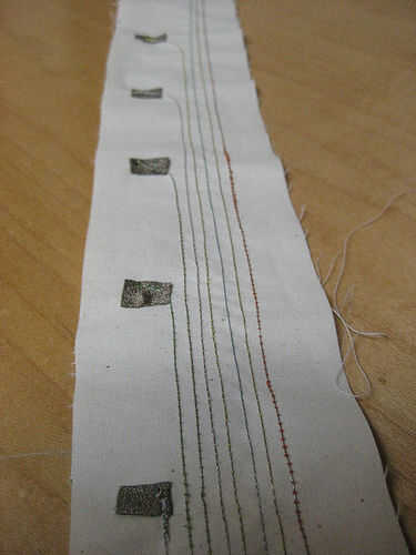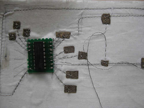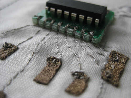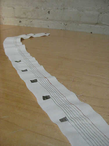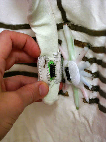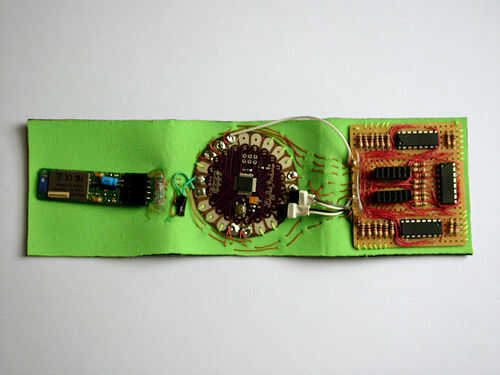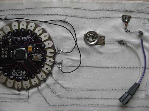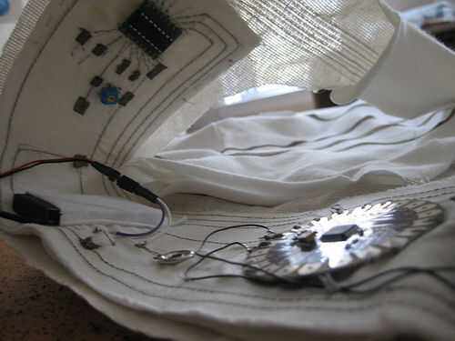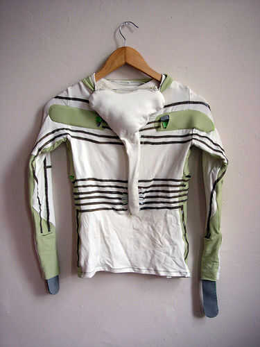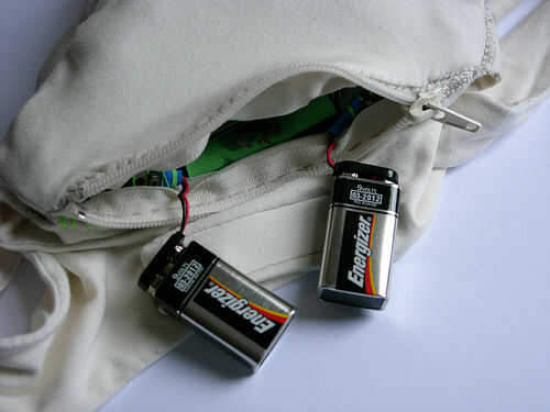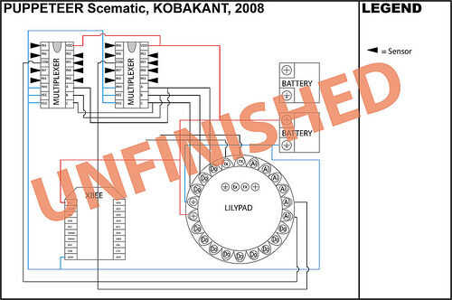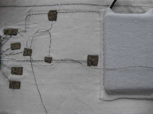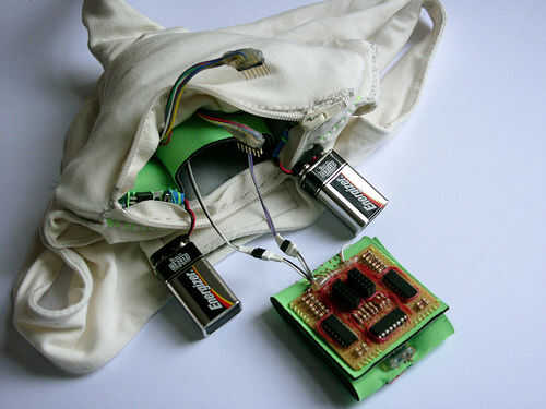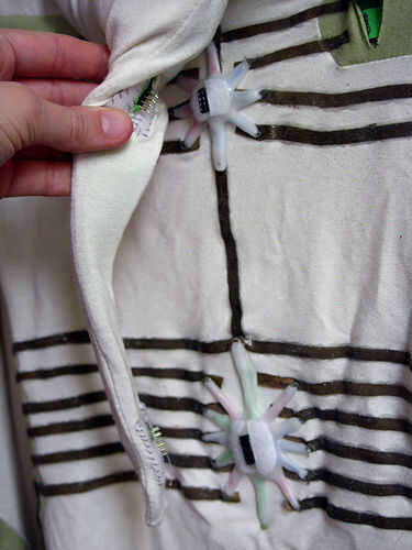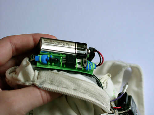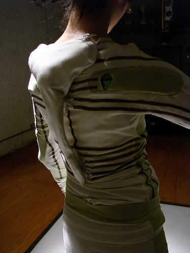 En el titiritero tercera versión que integramos los componentes en el collar del traje y el collar vino derecha hacia abajo de la parte delantera del traje, llegando a la parte superior de los muslos y enchufar en los extremos de los rastros conductores vía metal poppers. En ambos casos tuvimos acceso al circuito abriendo una cremallera de la mochila pequeña o el collar.
