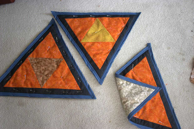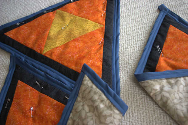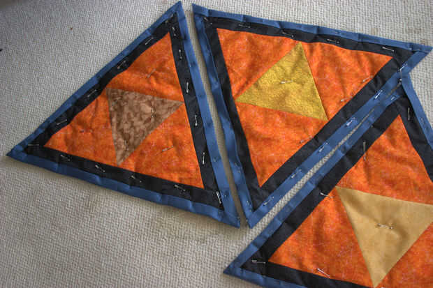 Mientras estaba en él, cosido a través de las costuras donde el borde negro reunió los triángulos grandes y a lo largo de las fronteras de color entre los triángulos interiores. Este tipo de costura es lo que le da ese look clásico acolchado, y también mantiene cada triángulo plano como se flexiona. Trate de usar una línea larga para todas sus puntadas de acolchado; desea que al final de algunos hilos sueltos como sea posible.