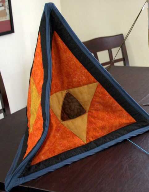 Usando un color de hilo que coincida con su enlace, coser los bordes juntos. Colocar triángulos espalda con espalda (lados derecho hacia fuera) y simplemente coser el borde. Aunque esto crea un labio en la parte exterior (con borde) del producto final, porque ya se acaban los triángulos con enlace me parece estéticamente aceptable. Repita el proceso con el triángulo final y los dos bordes. Después se suturan los bordes debe tener una pirámide suave, casi capaz de estar parado sus el propios.