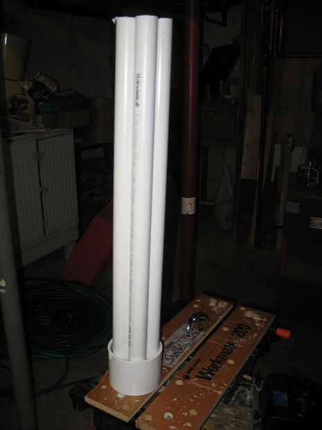 Con el cañón todavía insertado en la fresadora con la EPS espuma hilo en los tres anillos recién cortados, los dos más delgado suena primero y todo el conjunto con el 4" a 3" acoplador del casquillo.