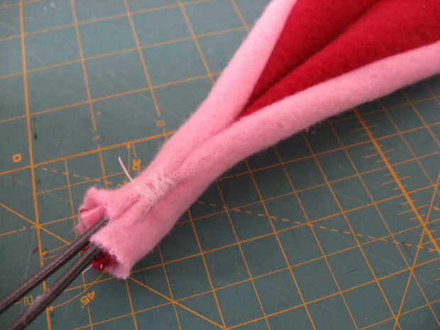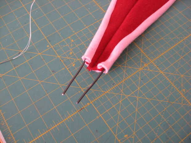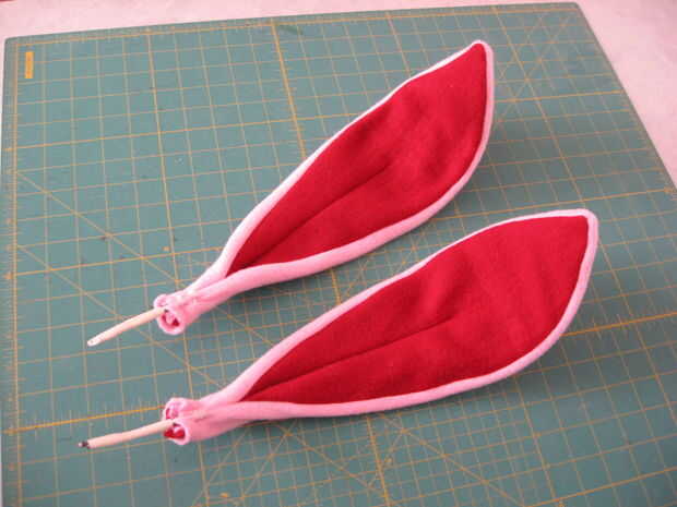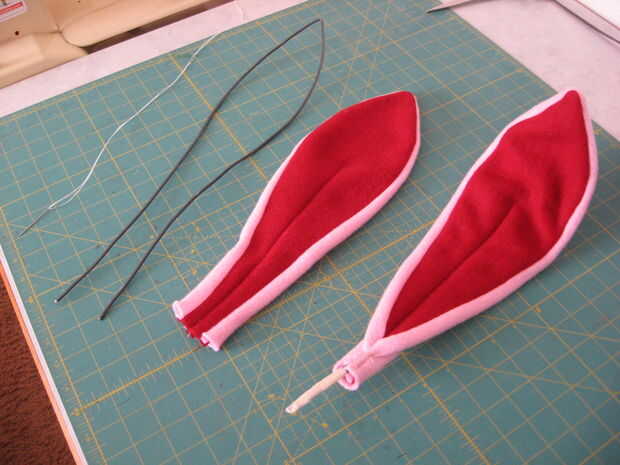 Cerca de tres pies de alambre fue utilizado para cada oído. Fue doblado por la mitad, insertado en las orejas y fustigó en su lugar con hilo dental encerado. Coser a mano con hilo dental encerado hace cosas realmente seguro. No estoy seguro de donde tomé este truco, pero lo uso mucho.