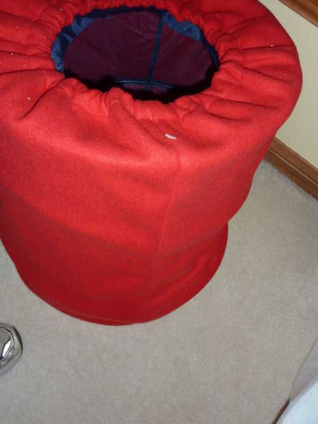 1. La cesta de medir y cortar suficiente tela roja para caber alrededor de él, con unas pocas pulgadas que en la parte superior del cesto