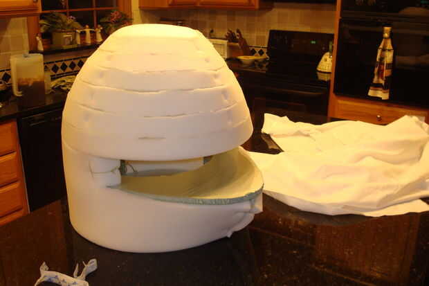 Las capas de fondo no son malas, simplemente Envuelva la espuma alrededor de la barbilla y la boca, cortando el exceso, en caso necesario. Asegure la espuma a la estructura de enhebrar el hilo a través de la espuma y atarla a la estructura