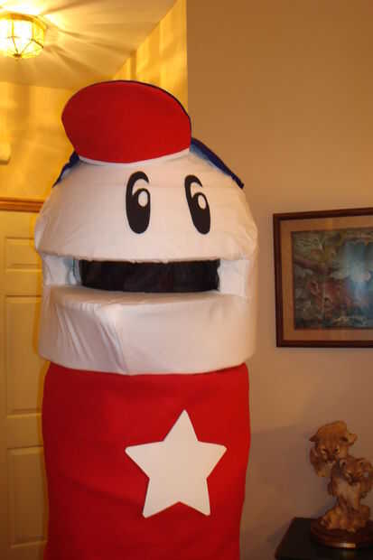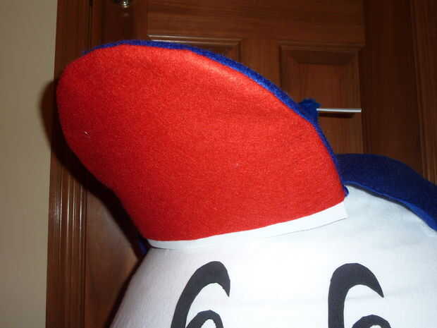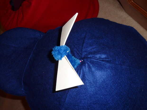 Para el sombrero, corta un círculo de diámetro de 2' de azul, luego cortar el círculo en cuartos. Cuando uno de los barrios se retira y se suturan los restantes 3 triángulos hace un sombrero con forma esférica. El proyecto de ley está hecha de espuma azul y roja con un trozo de tablero de la espuma en el medio para mantener rígida y hacer pie en la cabeza. Una vez que el proyecto de ley fue cosida a la tapa, lo del velcro-ed la tapa sobre su cabeza (en caso nunca quise cambiarla por otra prop)