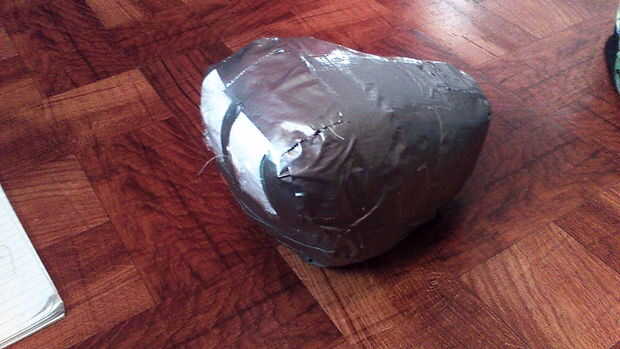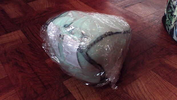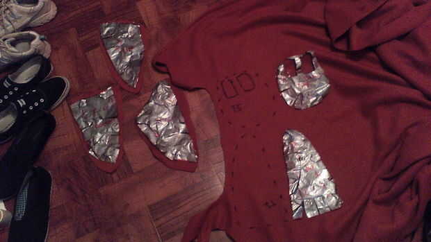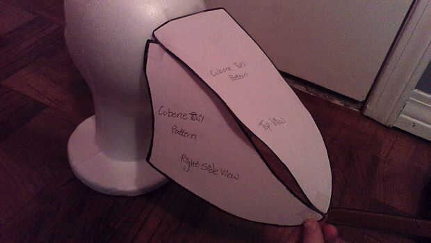 Utilicé el mismo método para hacer la tela de las pautas de la cola que utilizaba para la cabeza. La cola estaba envuelto con plástico transparente envoltura y cinta adhesiva. Entonces yo saqué los segmentos patrón para capturar las formas apropiadas necesarias para completar el look de la cola.