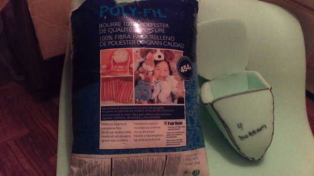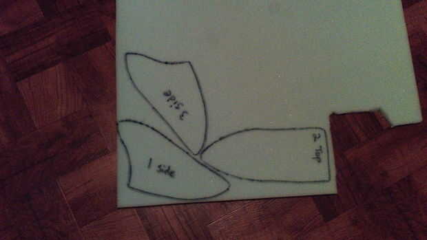 El lado del patrón trazó dos veces y el patrón superior se trazó una vez. El patrón de fondo era ligeramente más pequeño que el patrón superior, por lo que esperé para sacar un patrón para la parte inferior hasta que las otras tres partes se pegan. La cola era relleno con relleno de polietileno para asegurar que la forma quedaría. También hizo la cola super blandita! :)