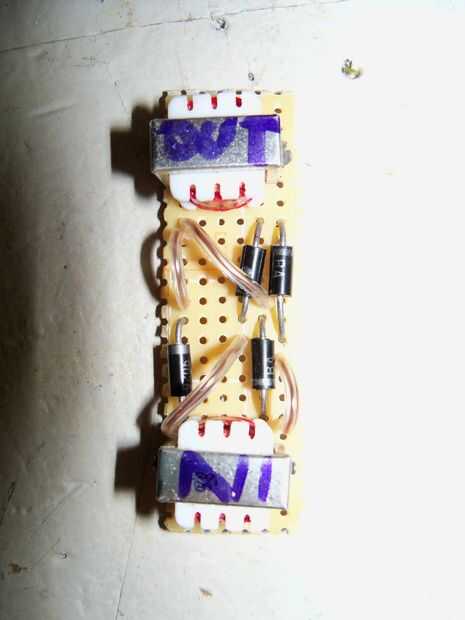 La belleza de este circuito es que si no hay dos sonidos de entrada, produce nada. Por lo tanto, alimenta a una de las entradas un constante sinusoidal de 40hz (descargar aquí) a través de un reproductor de mp3 y la otra entrada para un micrófono. Cuando hable en el micrófono completa la entrada y salidas de su voz modulada con esa onda. Ya tenía los diodos ahí y robaban los transformadores desde un teléfono antiguo, pero son ambos disponibles de Radio Shack si usted necesita comprar.