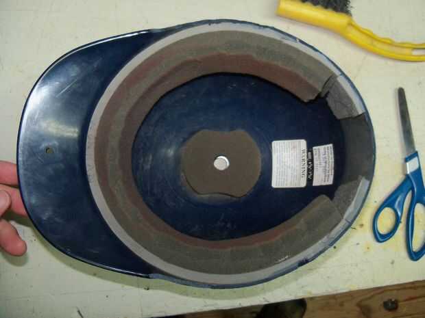 Encontré un casco de béisbol $ 3 en el fondo de comercio local, y apenas cabe mi cabeza de monstruo gigante. Fue muy ajustado, que decidí que era algo bueno para mantener esta gran cúpula de Dalek en lugar. Cuando llegué casa, lo primero que hice fue picar fuera la parte posteriora y los lados con mi dremel. También había retirado la espuma y entonces substituido con algunos que era un poco más fino me cabe un poco más cómodamente.