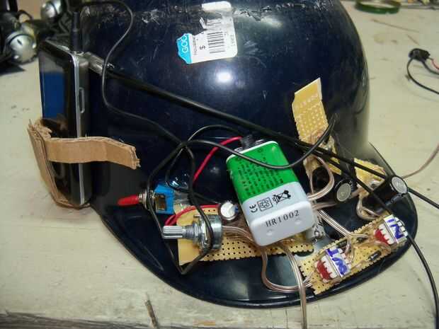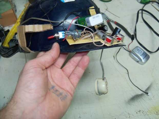 En este punto había soldado las bombillas incandescentes para el conductor de la voz y había pegado a los lados del casco. Había soldado de la luz en el pedúnculo a una resistencia de 470 ohm y luego a la batería en el circuito de modulador de voz y añadido un interruptor para todo enciende y apaga. Pegué este lío al borde y frente del sombrero.