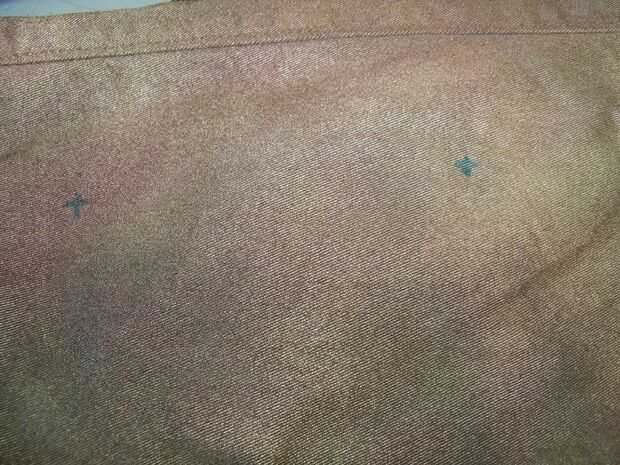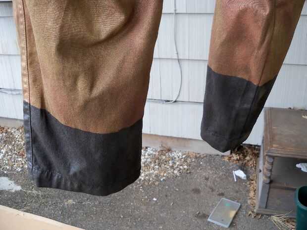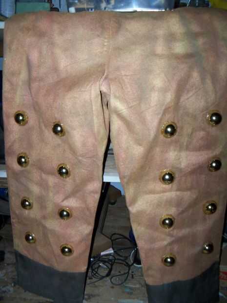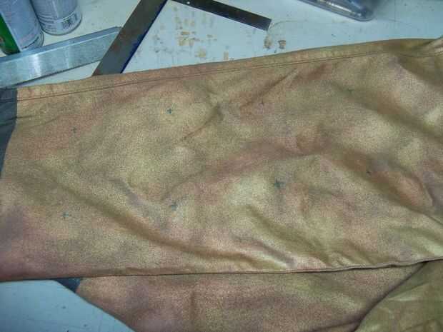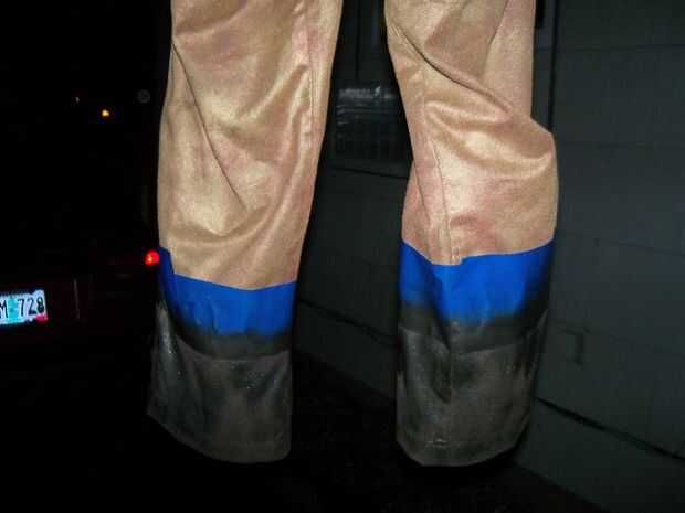 A partir de un barato par de pantalones color luz de fondo de comercio, había colgado de las cajas de almacenamiento de techo y pintado cobre, seguido de un ligero polvo de oro. El material de de que éstos fueron hechos aceptado el spraypaint fácilmente y no hay ningún problema. Después de que seque completamente, grabó desde el fondo seis pulgadas de cada pata y rocía 3-4 capas de bronce oscuro en ellas. Esto representa la sección del parachoques de un Dalek.