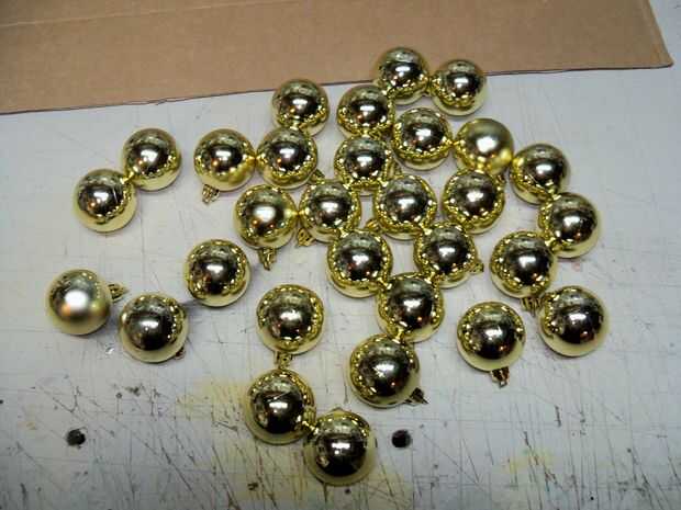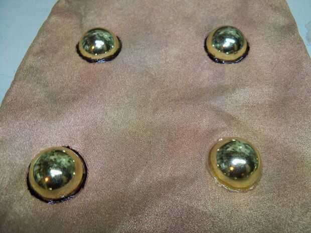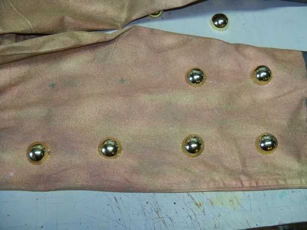 Me redondea un montón de oro bolas de adorno de Navidad desde el almacén del dólar y había rebanado en medio con un cuchillo de la caja. Por suerte, son tan barato y fino que una navaja afilada sólo resbaló justo a través de ellos sin problemas en absoluto. Después de marcar los pantalones con una malla regular (yo usé la costura exterior y la línea del parachoques como referencia), he utilizado pegamento caliente y epoxi para fijar a ellos, un total de 32 hemisferios son necesarios. Técnicamente un Dalek tiene 56 de estos (actúan como un dispositivo del destruct del uno mismo y posiblemente generar la pantalla de la fuerza de Dalek) pero no tengo mucho espacio en mis piernas.