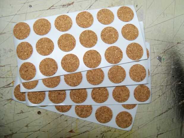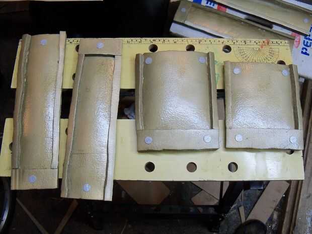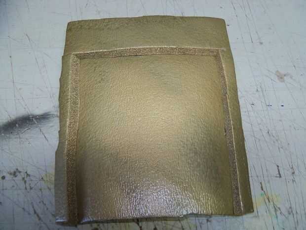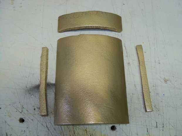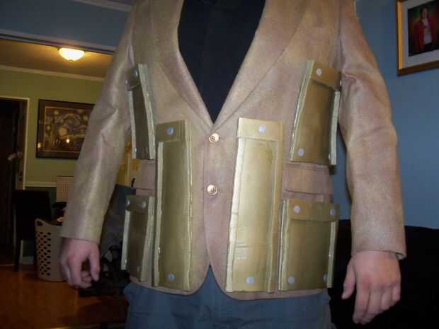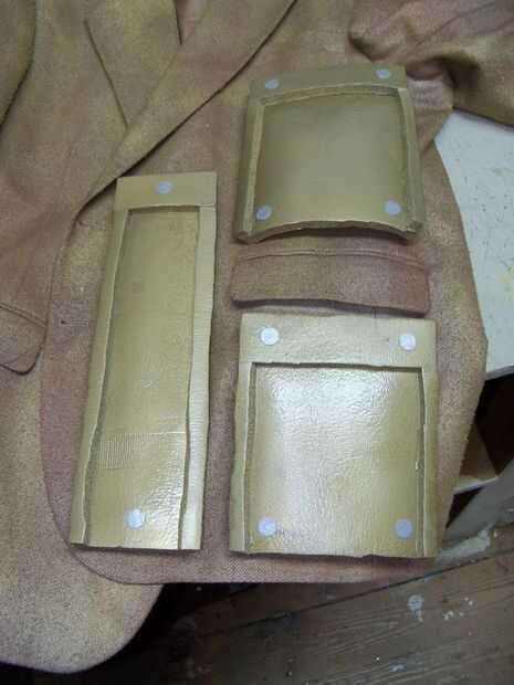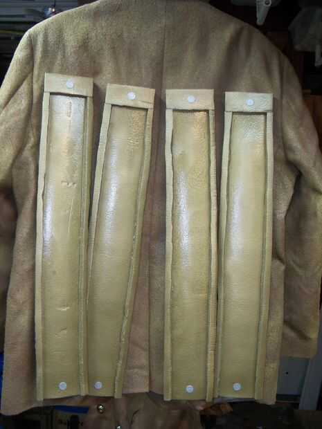 Después todos se cortaron, pinté con un par de capas del spraypaint Rustoleum "martillado", que da un aspecto muy fresco con textura a los paneles. Después de que seco montados los paneles, pegándolas con pegamento caliente y les dio una última capa de pintura para obtener los puntos había perdido. Por último, apliqué unas pegatinas de corcho redondo había pintado plata para representar a los pernos. Otro error que hice en ese momento estaba usando solamente pegamento para pegar los paneles a la chaqueta, yo debo han utilizado mi método habitual de pegamento caliente seguido de epoxy. Al final, perdí un par de paneles en momentos inoportunos.
