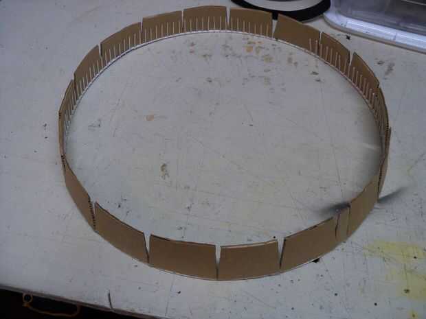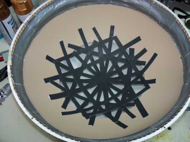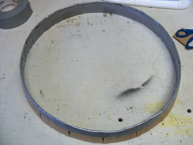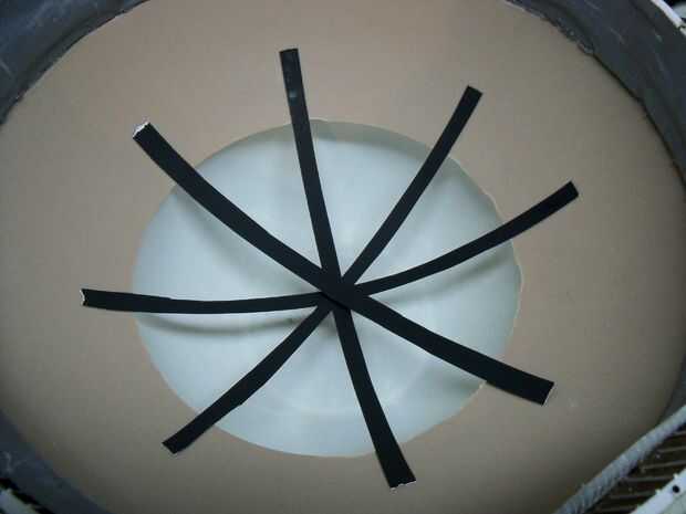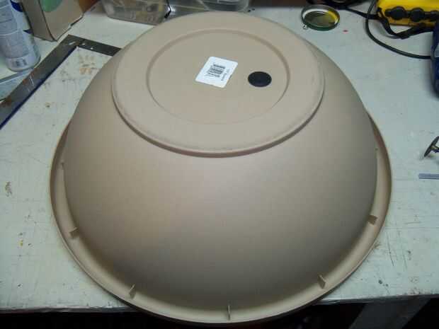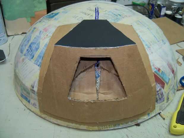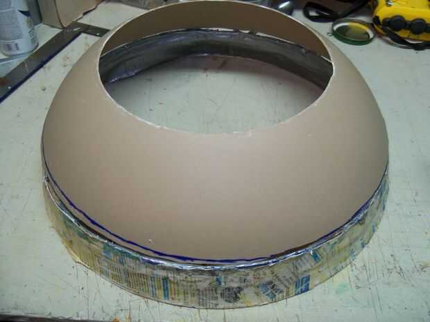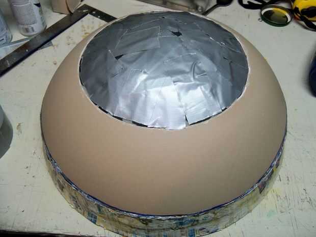 Cuando usted mira planes de Dalek, queda claro que la cúpula empieza en un ángulo pronunciado y unos 2-3 pulgadas por encima de los ángulos de la base de cambios un poco, por lo que no es una semiesfera perfecta. Para lograr este look, me llevó a la guardia de un ventilador roto y corte la parte superior. Había abultado para arriba un poco con cartón y cinta adhesiva, luego usa una maceta redonda grande para obtener la forma de cúpula de eso. Puesto que la olla tenía un fondo plano, cortó y usa tiras de cartón y cinta aislante para terminar la forma de cúpula.