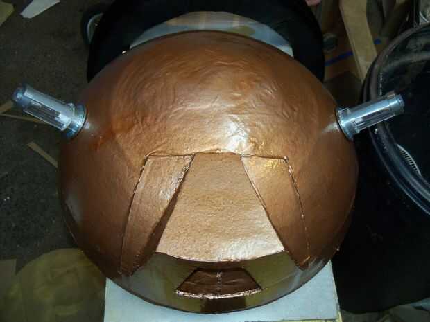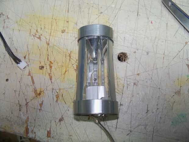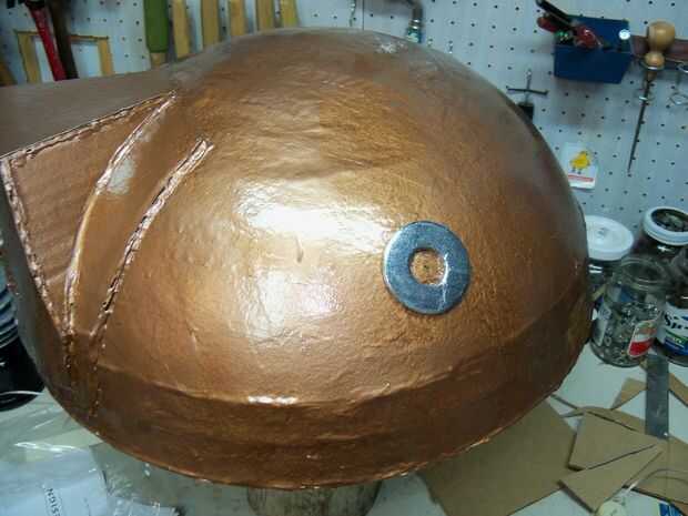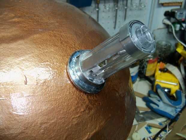 Una vez finalizado, cada luz estuviera pegado a una arandela grande. Una longitud de cable de altavoz funcionó a través de eso y en el casco, y toda la cosa estaba caliente pegado / ajustaron en su lugar.