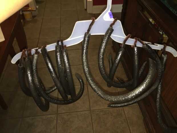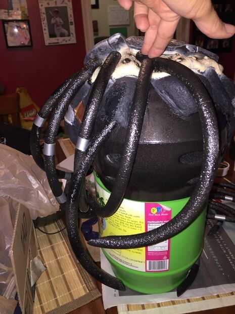 Me contacto cementado (pegado) la máscara hecha de antemano para un casco de bicicleta-venta (que he pintado de negro) para hacer la cara más llena. (Traté de vinilo pegamento, pegamento caliente y pegamento en vano... así que acabé utilizando cemento de contacto y sosteniendo la pieza hasta que se seca en el casco!) Tengo alguna barra de respaldo gris de la ferretería y córtelo en secciones 12-14" para los dreadlocks. Spray pintado cinta negra para y usado para la decoración de dreadlock. Acabé supergluing a la parte exterior de la máscara de un dreadlock 3D efecto, como los dreadlocks en la máscara de compra fueron muy decepcionantes.