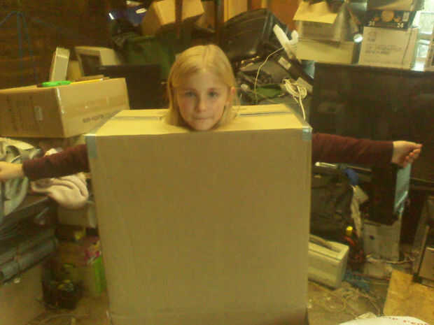teníamos que encontrar una caja, casi del mismo tamaño que sus hombros. Luego cortamos los agujeros del brazo y un gran agujero para la cabeza.