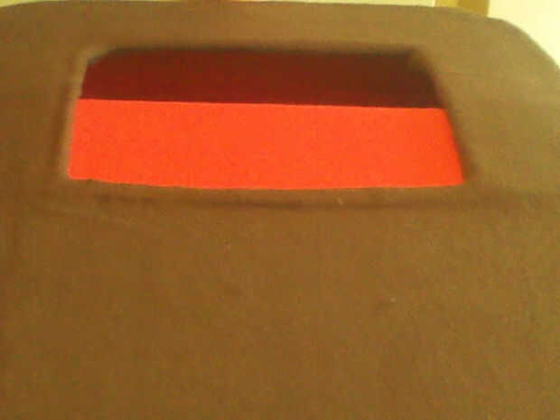 Adhesivo en aerosol uso poco a poco empezamos a envolver el cartón en material de fieltro marrón. Nuestra primera tarea fue envolver el interior con fieltro rojo, para crear la apariencia de boca ancha de la firma de Domo.