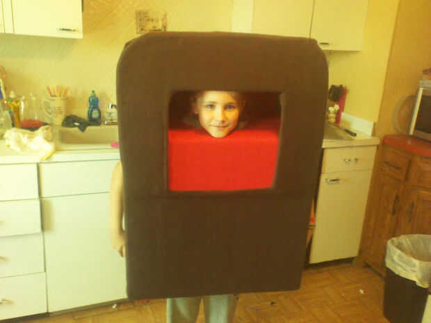 yo estaba atado por tiempo y dinero para un disfraz de Halloween, así que decidí ir de vieja escuela y ser creativo con un par de cajas, papel de construcción y sharpie. Si eres capaz, las cajas de costura juntos hace el traje mucho más durable.Paso