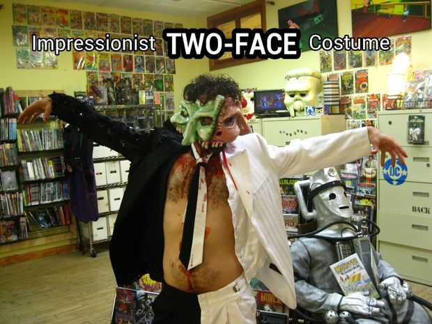 El traje de impresionista de dos caras es el mismo trato. No es significado como Harvey Dent. La gente probablemente reconocerá algunos de los elementos y averiguar lo que estoy haciendo, pero mi satisfacción no se basará en su capacidad para desentrañar mis intenciones. Era más importante crear algo llamativo, extraño y un poco bruto. Podría no saber quien soy, pero me notará!