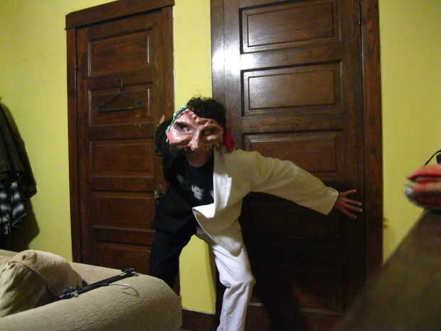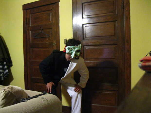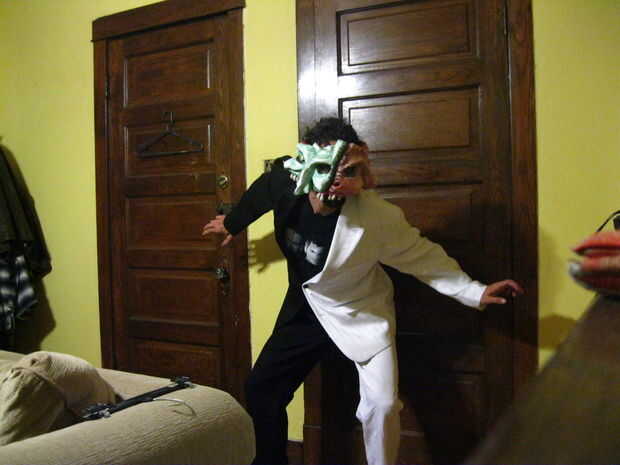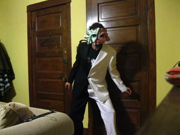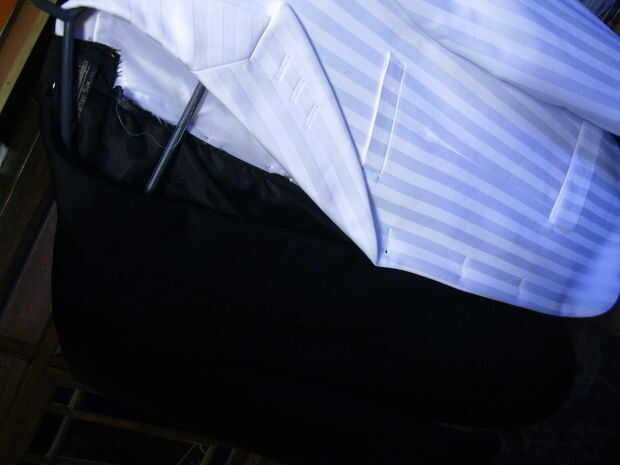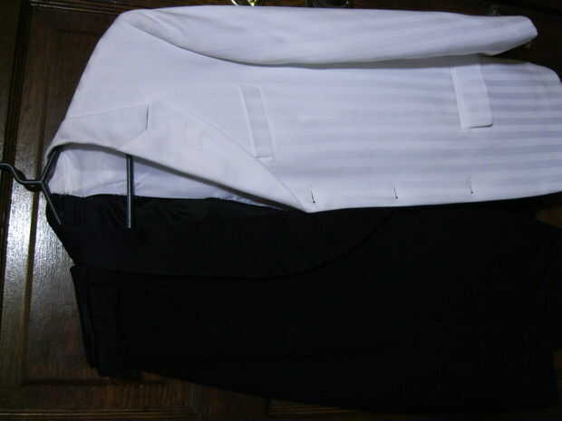 Cuando hice mi primera tienda corriendo a buscar trajes disponibles y no encontrado ninguno, había recogí una chaqueta de traje blanco como una maniobra de "sólo en el caso", pensando siempre podía teñir, pintar o personalizar según sea necesario. Y ya tenía una vieja chaqueta de esmoquin negro en mi armario, así utilicé. Y de un cercana vintage ropa tienda barata par de pantalones, uno negro y uno blanco.