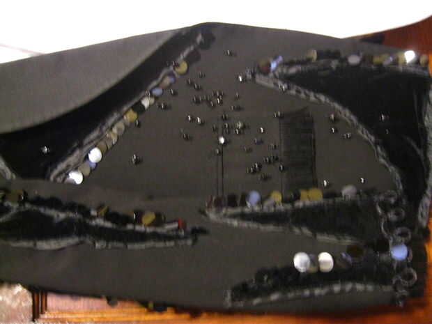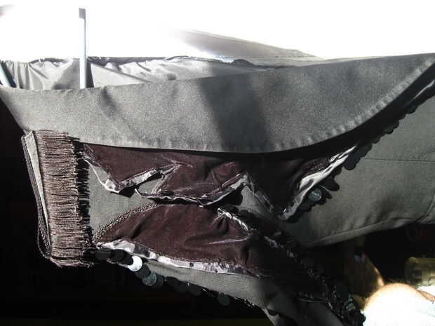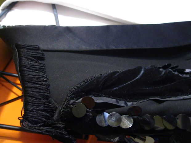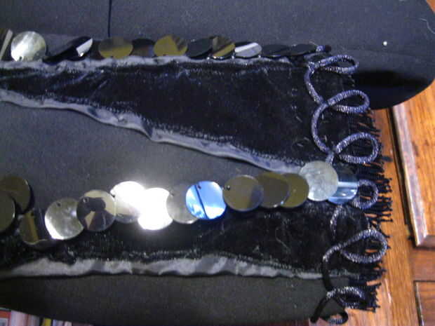 Siempre puedes encontrar cosas para la diversión barata en la tienda de la tela. Recogí algunos restos (satén, terciopelo) y varios tipos de liquidación trim (lentejuelas, medallones, fringe, trenza). Lo primero que hice fue hacer un epaulet para mi hombro derecho fuera de tela, flecos y trenza y luego cosidas en.