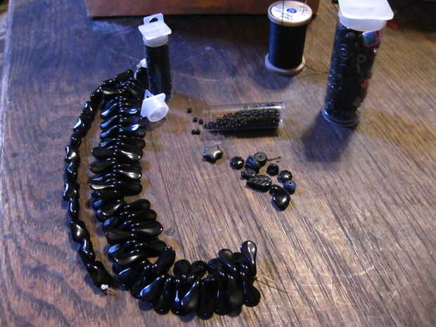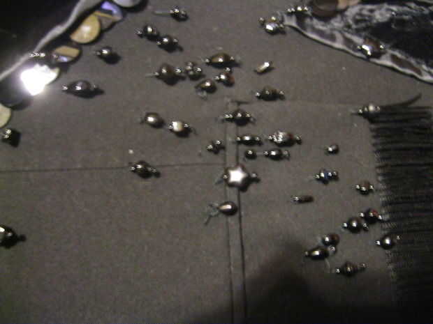 Pensé que quizás encontrar algunos encantos raros o algo así, para pintar negro y collar de la chaqueta, pero soy todo de spraypaint negro y usted no puede comprar en la ciudad. Así que una solución similar iba a ir a una tienda de grano. Compré algunos granos de la semilla negra, un par de hilos de perlas negras en diferentes formas y algunos frascos de cuentas checas (estos fueron ordenados por color, por lo que los frascos que tengo en su mayoría eran negros). Procedí a combinar y aplicar cientos de racimos de grano pequeño a la chaqueta. Tomó mucho tiempo. Y era totalmente la pena.