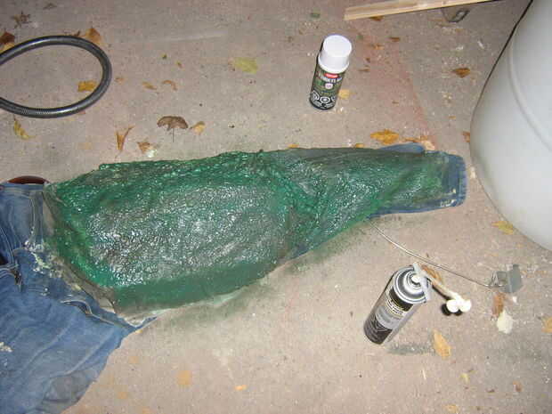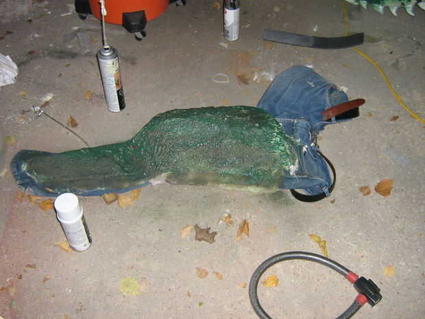 He utilizado un viejo par de pantalones vaqueros que había estado utilizando hasta ahora, para trabajar en los otros pasos, ya había sido algo cubierto con trozos de espuma en aerosol y caliente pegamento, por lo que fueron un digno sacrificio al dragón.