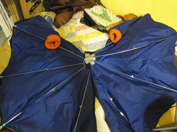 he añadido algunos brazaletes suaves y elásticas de la chompa en dos de las puntas de las alas. Él deslizará su brazo en éstos y van a quedar en alrededor de sus bíceps, por lo que sus manos están libres. Utilicé la máquina de coser para poner estos. En este paso, también usé cinta adhesiva para cubrir los bordes ásperos y scratchy de los cables donde se reunieron en la base de las alas. ¿Difícil de explicar... ver el conducto de cinta en el centro de la imagen? Allí.
