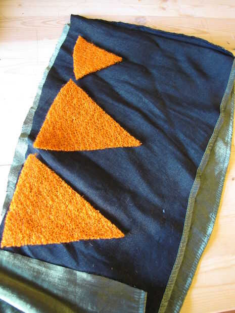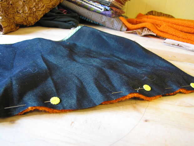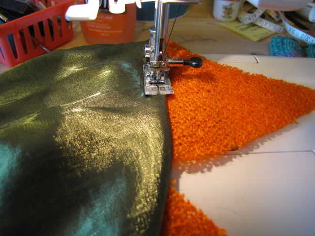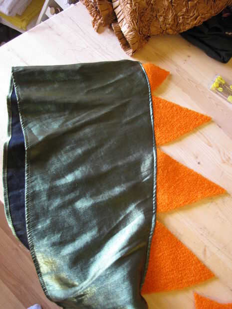 Utilicé algunas de la falda con para la campana y vuelta adentro hacia fuera, fijados las aletas en lugar antes de coser una costura de la espalda. Yo superior había cosido lo que serían puntiagudas y sobresalen. He añadido un punto de velcro justo debajo de la barbilla de mi chico a cada lado de la campana por lo que permanecerá en el bien.