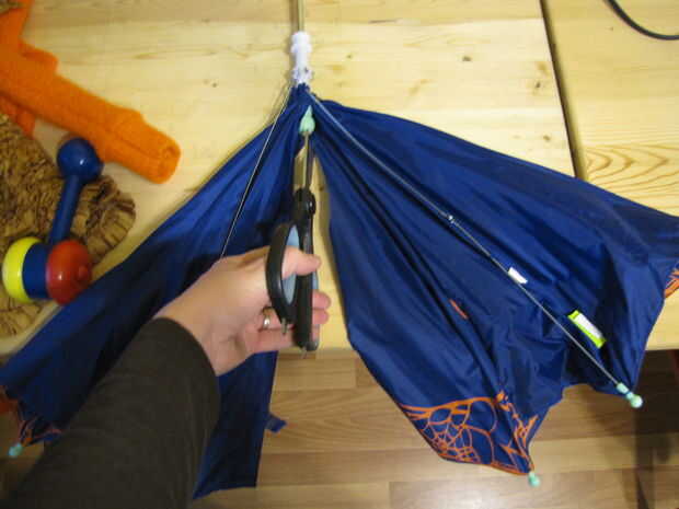 Yo utiliza tijeras para cortar el paraguas en la mitad. He dejado las espinas en el lugar que sostienen a la tela del paraguas en su lugar. Estas eran las alas 'fusión'!